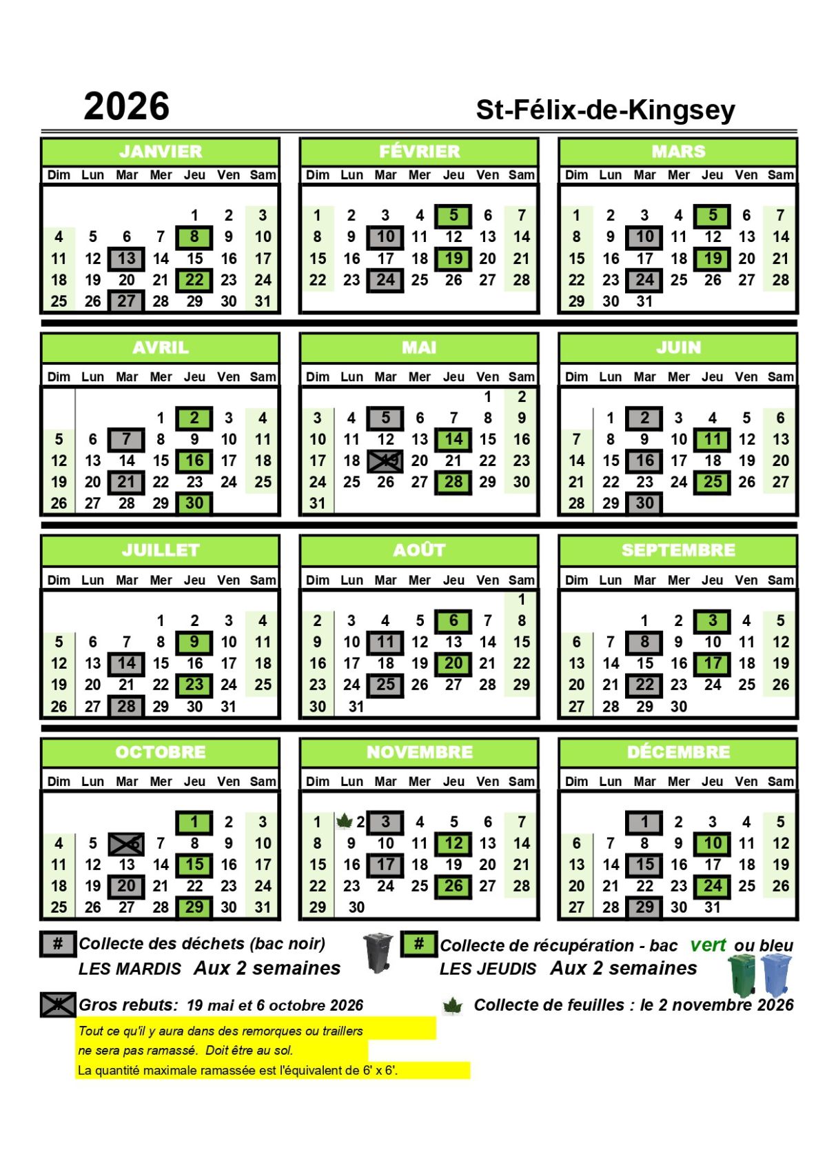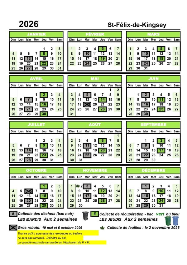Calendrier des collectes Calendrier des collectes Municipalité de Saint-Félix de Kingsey
